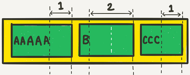 각 아이템의 컨텐츠가 “AAAAA”, “B”, “CCC”로 원래의 크기가 다르기 때문에 전체 아이템의 크기가 살짝 애매한 비율로 보이지만, 여백의 비로 생각해 보면 정확히 1:2:1이죠!